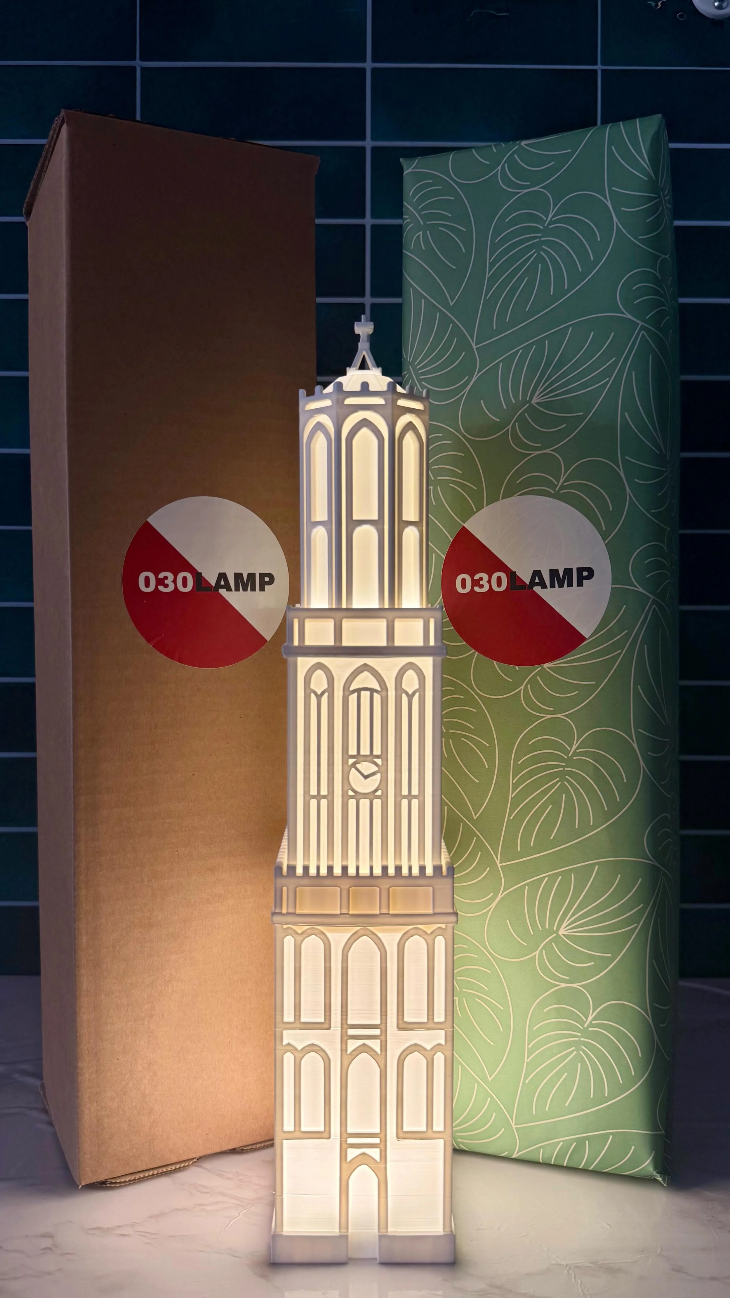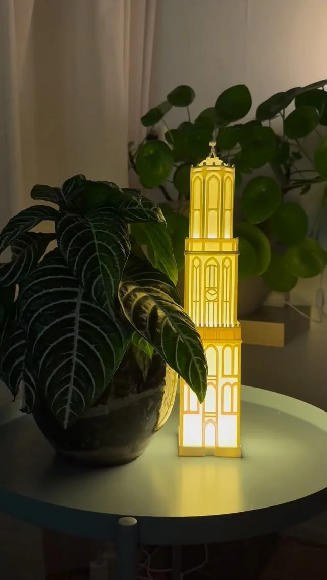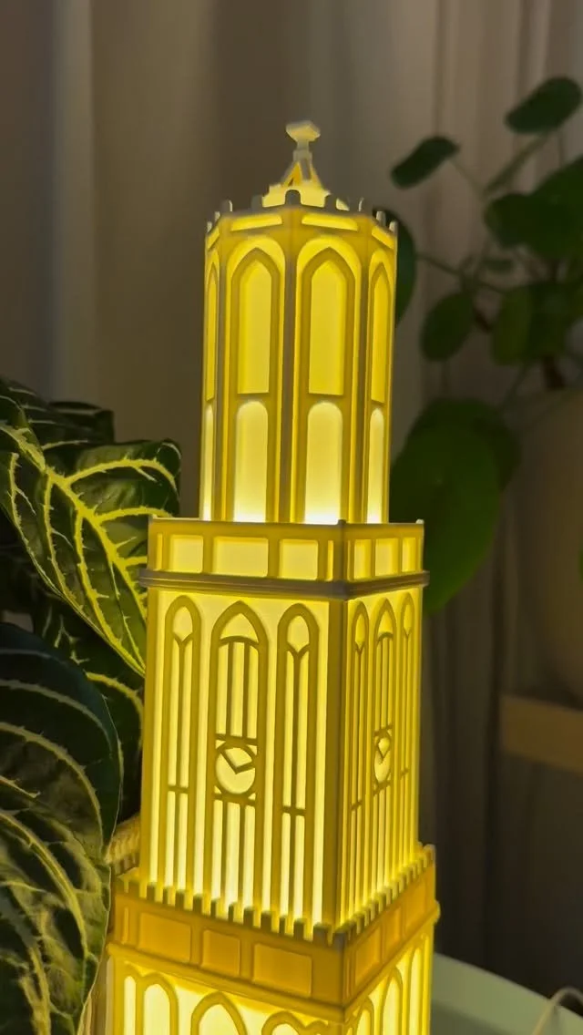 Deze Domtorenlamp is een verfijnde 3D-geprinte interpretatie van het bekendste silhouet van de stad, ontworpen als sfeervol interieurobject.