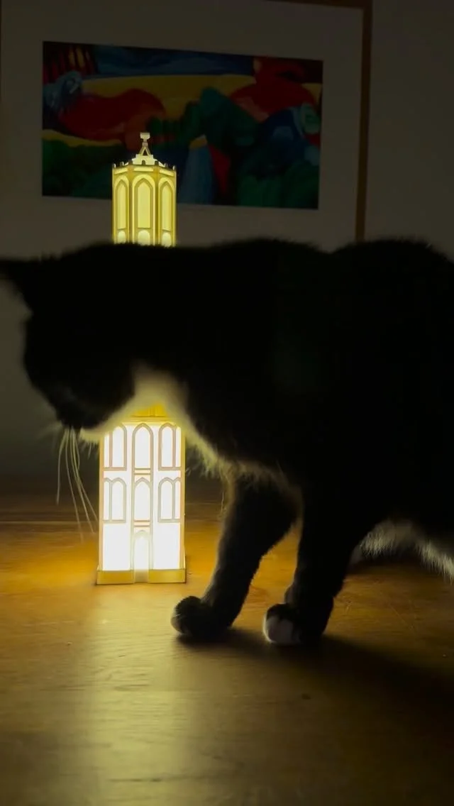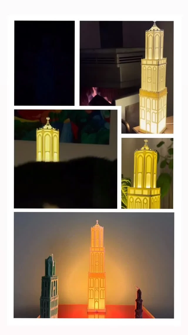 De Domlamp is geprint in zacht wit materiaal, waardoor het licht subtiel door de toren heen schijnt. Het resultaat is een warme, rustige gloed die perfect past in de avond: aanwezig, maar nooit schreeuwerig.